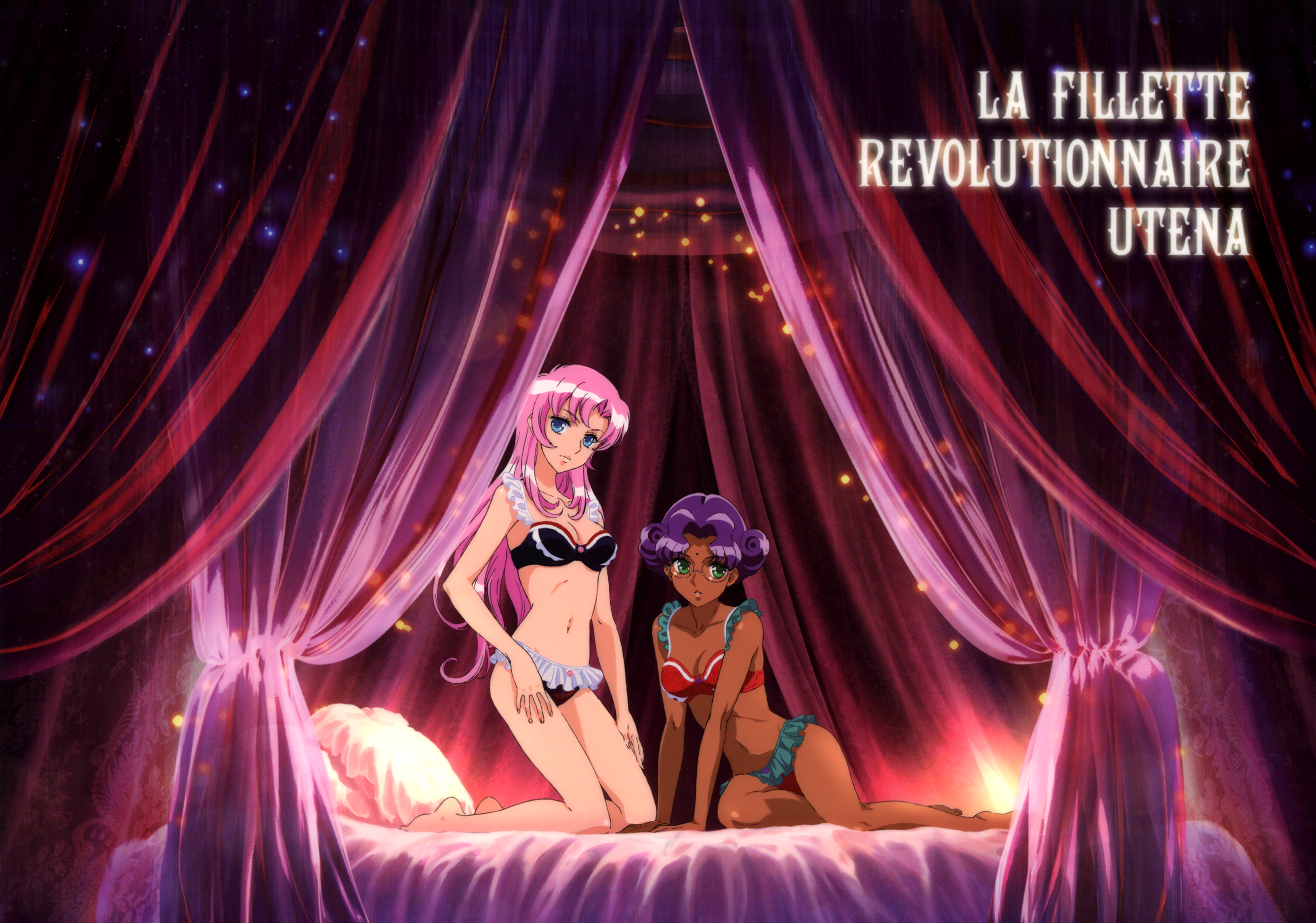 Description: Supergroupies, a company that does very particular, decently high end swag, such as purses and umbrellas, also did two sets of a bra and panties themed around Utena and Anthy. This was a clear file purchase benefit that came with them, and is drawn by Hasegawa, making it official series art. Yes, they're wearing the lingerie you could purchase. I didn't draw it.